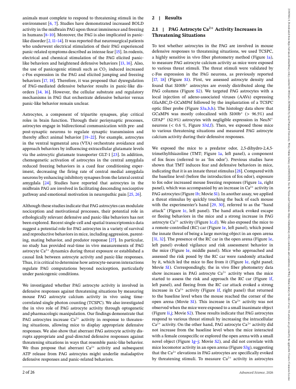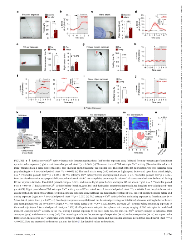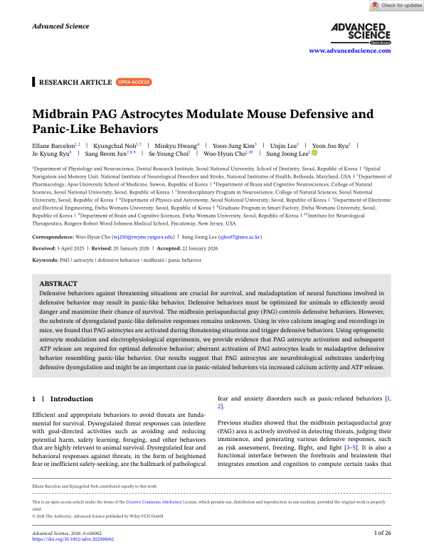 Ellane Barcelon#, Kyungchul Noh#, Minkyu Hwang, Yoon-Jung Kim, Unjin Lee, Yeon Joo Ryu, Je-Kyung Ryu, Sang Beom Jun, Se-Young Choi, Woo-Hyun Cho*, Sung Joong Lee*. Midbrain PAG Astrocytes Modulate Mouse Defensive and Panic-Like Behaviors. Advanced Science, e06062 (2026).