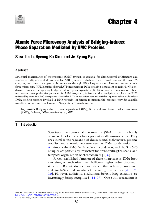 Sara Illodo, Hyeong-ku Kim, Je-Kyung Ryu*. Atomic Force Microscopy Analysis of Bridging-Induced Phase Separation Mediated by SMC Proteins. In SMC Proteins (eds Murayama, Y., Kakui, Y.) Methods in Molecular Biology 2991, 69-82 (Humana, New York, 2026).
