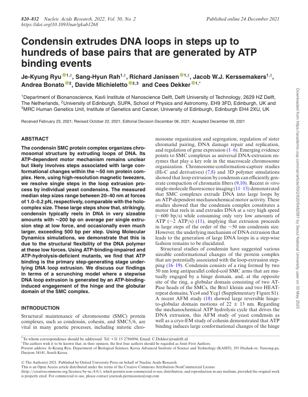 Je-Kyung Ryu#, Sang-Hyun Rah#, Richard Janissen#, Jacob W. Karppenmakers#, and Cees Dekker*. Condensin extrudes DNA loops in steps upto hundreds of base pairs that are generated by ATP binding events. Nucleic Acids Research 50(2), 820-832 (2022).