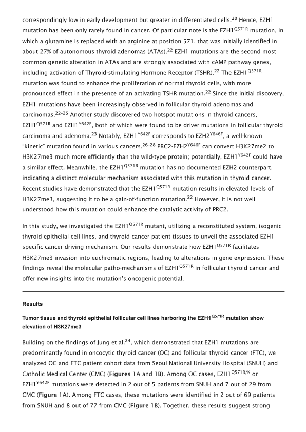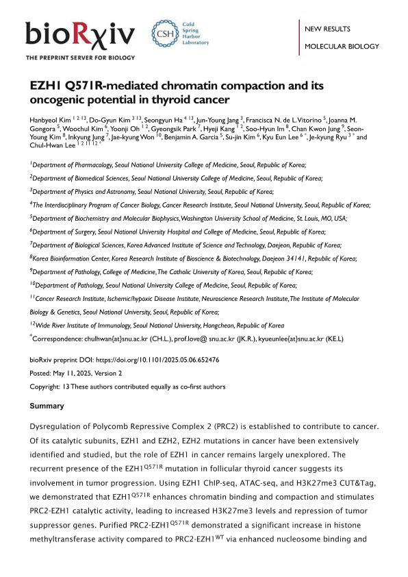 Hanbyeol Kim#, Do-Gyun Kim#, Seongyun Ha, Jun-Young Jang, Francisca N. de L. Vitorino, Joanna M. Gongora, Woochul Kim, Yoonji Oh, Gyeongsik Park, Hyeji Kang, Soo-Hyun Im, Chan Kwon Jung, Seon-Young Kim, Inkyung Jung, Jae-Kyung Won, Benjamin A. Garcia, Su-Jin Kim, Kyu Eun Lee, Je-Kyung Ryu*, Chul-Hwan Lee*. EZH1 Q571R-mediated chromatin compaction and its oncogenic potential in thyroid cancer. bioRxiv (2025).