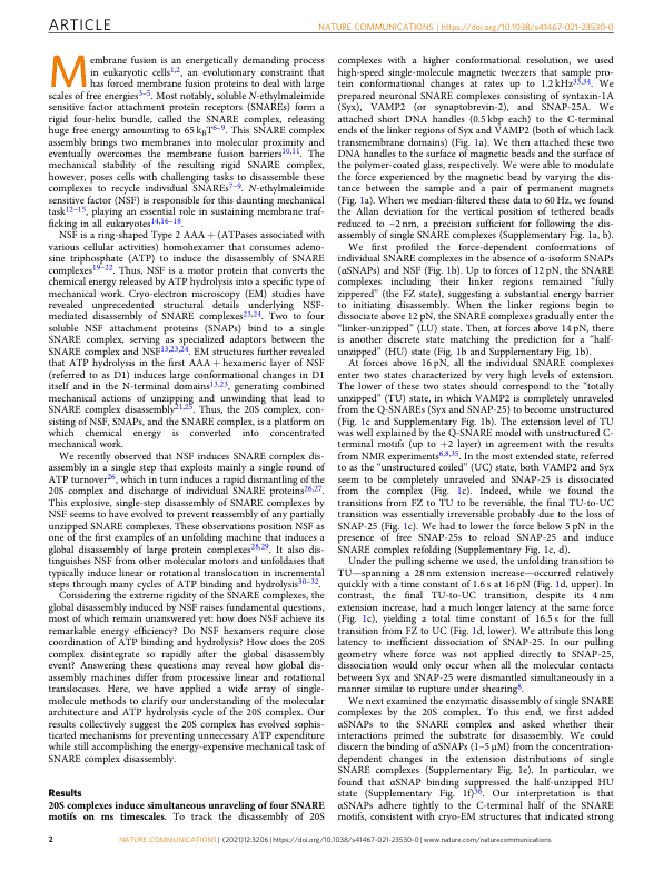 Changwon Kim#, Min Ju Shon#, Sung Hyun Kim, Gee Sung Eun, Je-Kyung Ryu, Changbong Hyeon, ReinhardJahn and Tae-Young Yoon*.Extreme parsimony in ATP consumption by 20S complexes in the global disassembly of single SNARE complexes. Nature Communications 12, 3206 (2021).