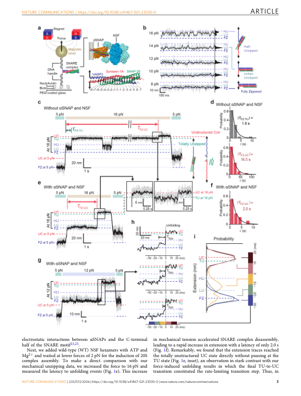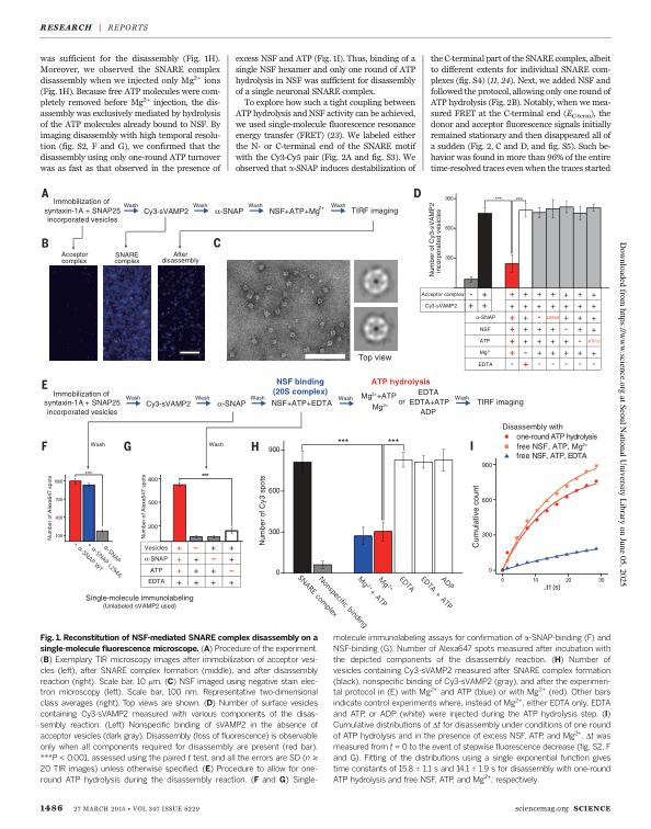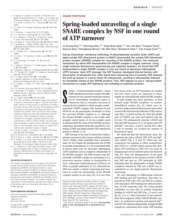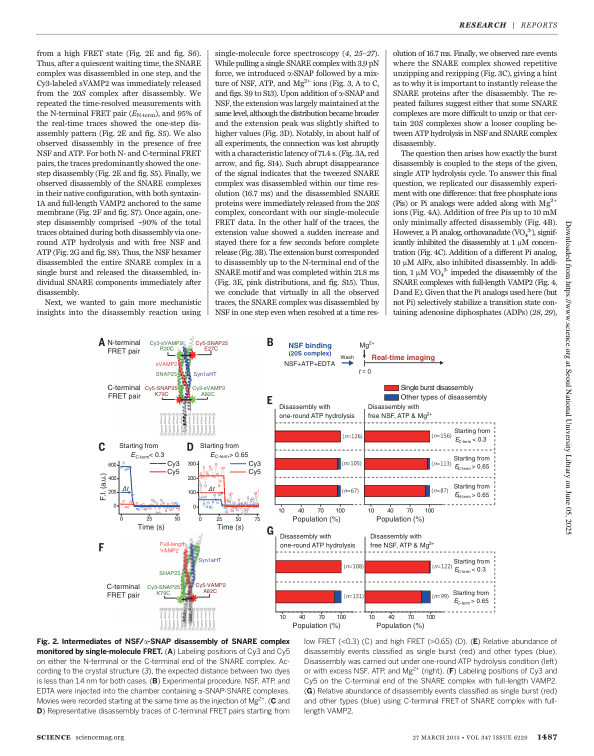 Je-Kyung Ryu#, Duyoung Min#, Sang-Hyun Rah#, Soo Jin Kim, Yongsoo Park, Haesoo Kim, Changbong Hyeon, Ho Min Kim, Reinhard Jahn &Tae-Young Yoon. Spring-loaded unraveling of a single SNARE complex by NSF inone round of ATP turnover. Science 347(6229), 1485-1489 (2015).
