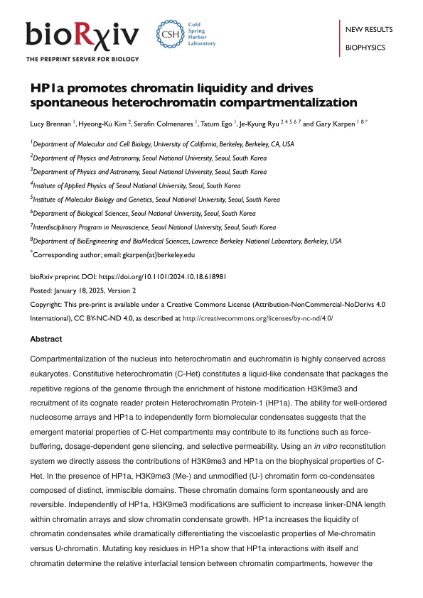Lucy Brennan#, Hyeong-Ku Kim, Serafin Colmenares, Tatum Ego, Amit Kumar, Sam Safran, Je-Kyung Ryu, Gary Karpen*. HP1a promotes chromatin liquidity and drives spontaneous heterochromatin compartmentalization. bioRxiv (2024).