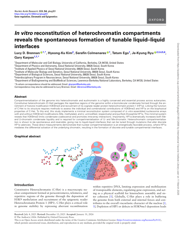Lucy Brennan#, Hyeong-Ku Kim, Serafin Colmenares, Tatum Ego, Amit Kumar, Sam Safran, Je-Kyung Ryu, Gary Karpen*. In vitro reconstitution of heterochromatin compartments reveals the spontaneous formation of tunable liquid-liquid interfaces. Nucleic Acids Research 54(5), gkag201 (2026).