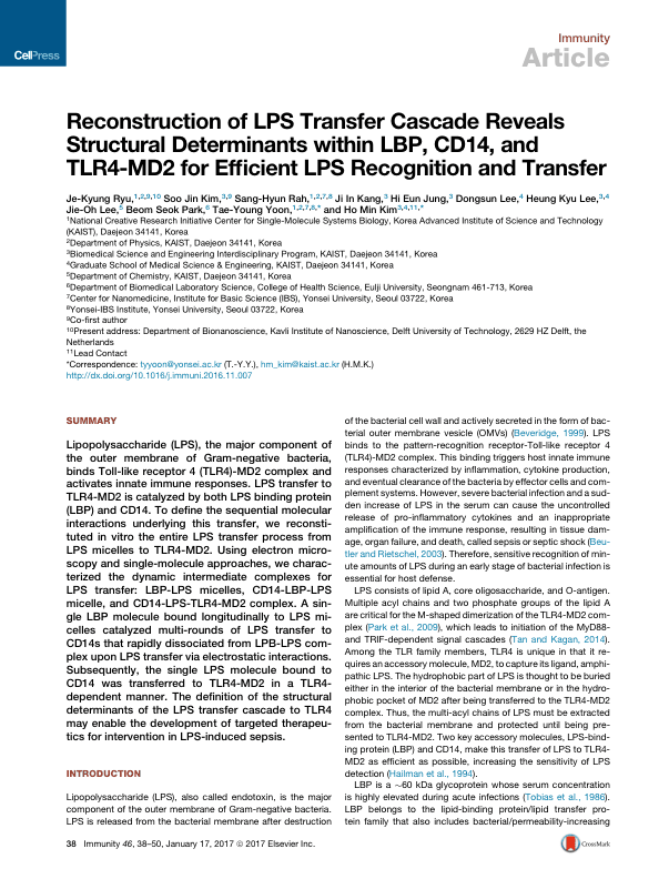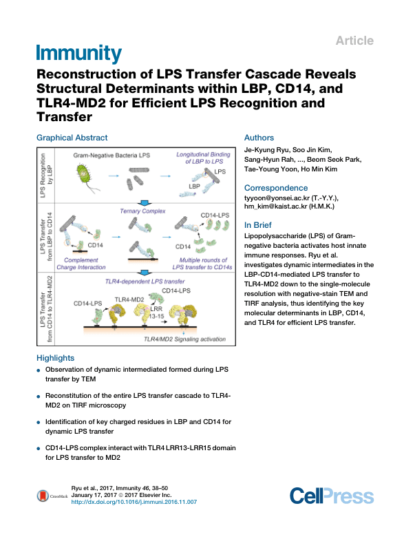 Je-Kyung Ryu#, Soo Jin Kim#, Sang-Hyun Rah, Ji In Kang, Hi Eun Jung, Heung-Kyu Lee, Jie-Oh Lee, Beom Seok Park, Tae-Young Yoon*, and Ho Min Kim*. Reconstruction of LPS transfer cascade reveals structural determinants within LBP, CD14 and TLR4-MD2 for efficient LPS recognition and transfer. Immunity 46(1), 38-50 (2017).