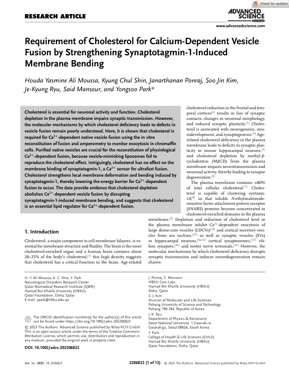 Houda Yasmine Ali Moussa, Kyung Chul Shin, Janarthanan Ponraj, Soo Jin Kim, Je-Kyung Ryu, Said Mansour, Yongsoo Park. Requirement of Cholesterol for Calcium-Dependent Vesicle Fusion by Strengthening Synaptotagmin-1-Induced Membrane Bending. Advanced Science 10(15), 2206823 (2023).
