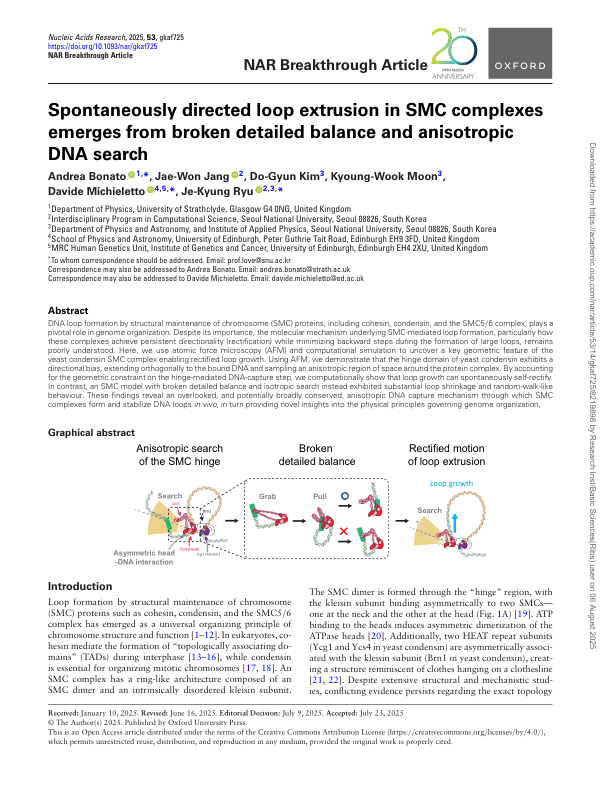Andrea Bonato#*, Jae-Won Jang, Do-Gyun Kim, Kyoung-Wook Moon, Davide Michieletto*, Je-Kyung Ryu*.Spontaneously directed loop extrusion in SMC complexes emerges from broken detailed balance and anisotropic DNA search. Nucleic Acids Research 53(14), gkaf725 (2025).